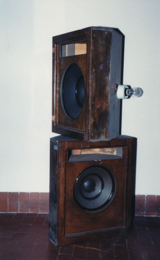 Museo dell'industria e del lavoro Altoparlanti da parete Inventario collezioni - Reperto n°80 Due altoparlanti da parete ad un diffusore per sala di registrazione, sistemati in box di legno trapezoidali, con una lampada posta sul retro di una cassa Riferimenti N° inventario: 80 Quantità: 2 Descrizione oggetto Oggetto: Altoparlanti da parete Didascalia: Due altoparlanti da parete ad un diffusore per sala di registrazione, sistemati in box di legno trapezoidali, con una lampada posta sul retro di una cassa Tipologia: Altoparlanti Categoria (1): Tecniche del suono Categoria (2): Fotocinematografia Settore produttivo: Cinematografico e televisivo Settore di impiego: Cinema e televisione Costruttore: Giuseppe Donato Nazione di produzione: Italia Città di produzione: Milano Stato di conservazione: Buono Cronologia Data di fabbricazione: 1940 Specifica per la data di fabbricazione: circa Anno di inizio funzionamento: 1940 Specifica per la data di fabbricazione: circa Specifica per la data di fabbricazione: data esatta Opificio di provenienza Opificio: Cinestabilimento fratelli Donato Specifiche fisiche e tecniche Altezza (cm): 50 Larghezza (cm): 35 Profondità (cm): 50 Materiali: Ceramica Ghisa Legno Metallo Plastica Vetro Tipo di trazione / funzionamento: Non specificata Dettagli trazione: Elettrica Reperto non funzionante Collocazione Collocazione generale: Musil di Rodengo Saiano Collocazione di provenienza: Via don Giacomo Vender, 45 Note e bibliografia Note scheda: Inventario Donato 45 Note tecniche: Apparecchio che amplifica i suoni trasformando l'energia di correnti elettriche modulate a frequenza acustica in energia meccanica di vibrazione Note storiche: Costruiti artigianalmente da Giuseppe Donato Proprietà del reperto Proprietà: Fondazione Luigi Micheletti Proprietà: Fondazione Luigi Micheletti Acquisizione Tipo di acquisizione: Dono Data di acquisizione: 13/02/1992 Validità della data di acquisizione: gg/mm/aaaa Donante: Donato film Fotografie Due altoparlanti da parete ad un diffusore per sala di registrazione, sistemati in box di legno trapezoidali, con una lampada posta sul retro di una cassa