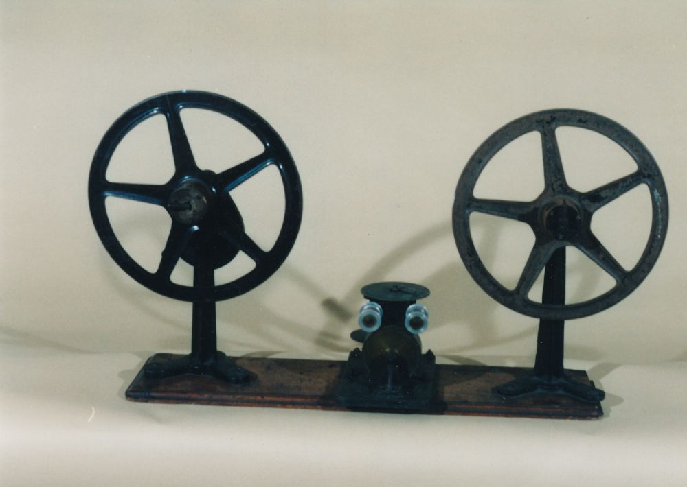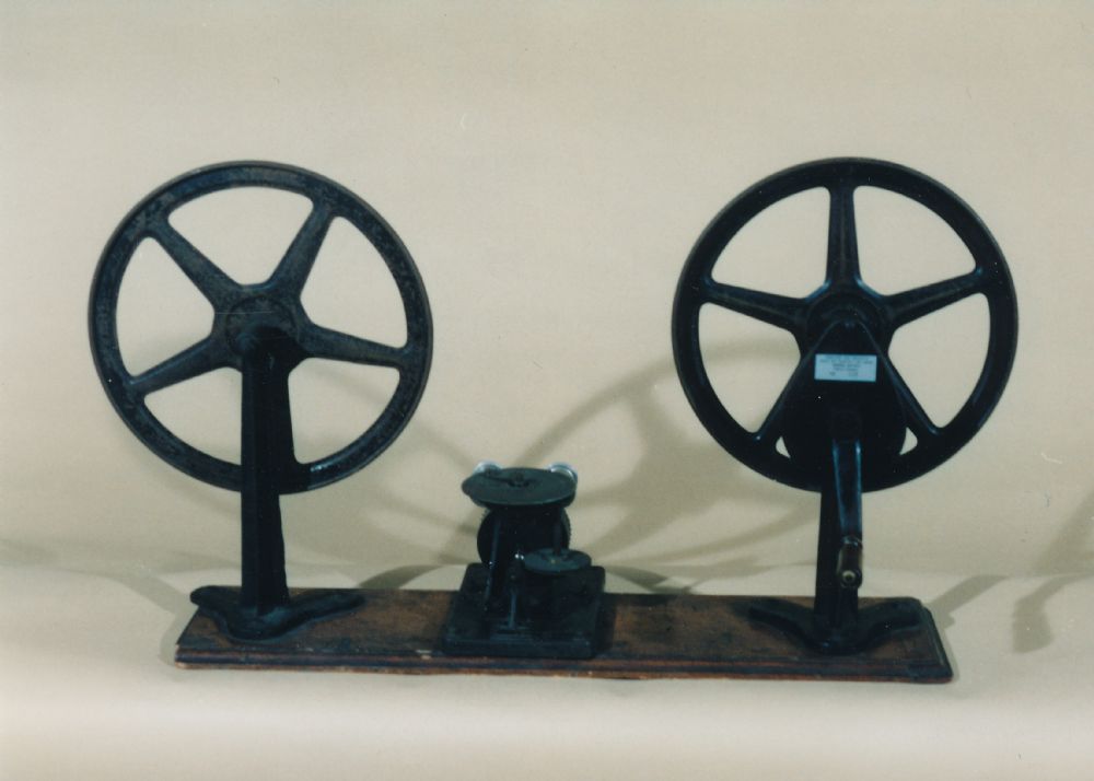 Misuratore manuale di metraggio delle pellicole 35mm, fissato su tavoletta in legno, con 2 portabobine, manovella contagiri graduato.