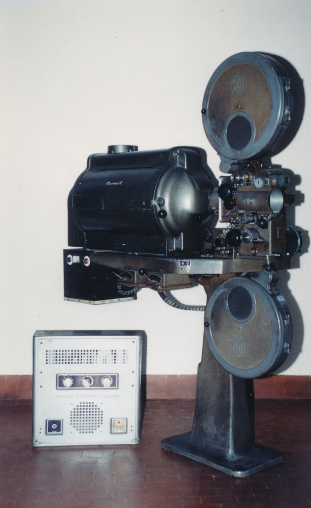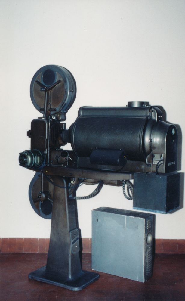 Proiettore 35mm Bauer con modifiche Prevost, con 2 portabobine, indicatore analogico ampere anteriore e indicatore analogico ampere laterale. Con stabilizzatore Prevost modello 152.