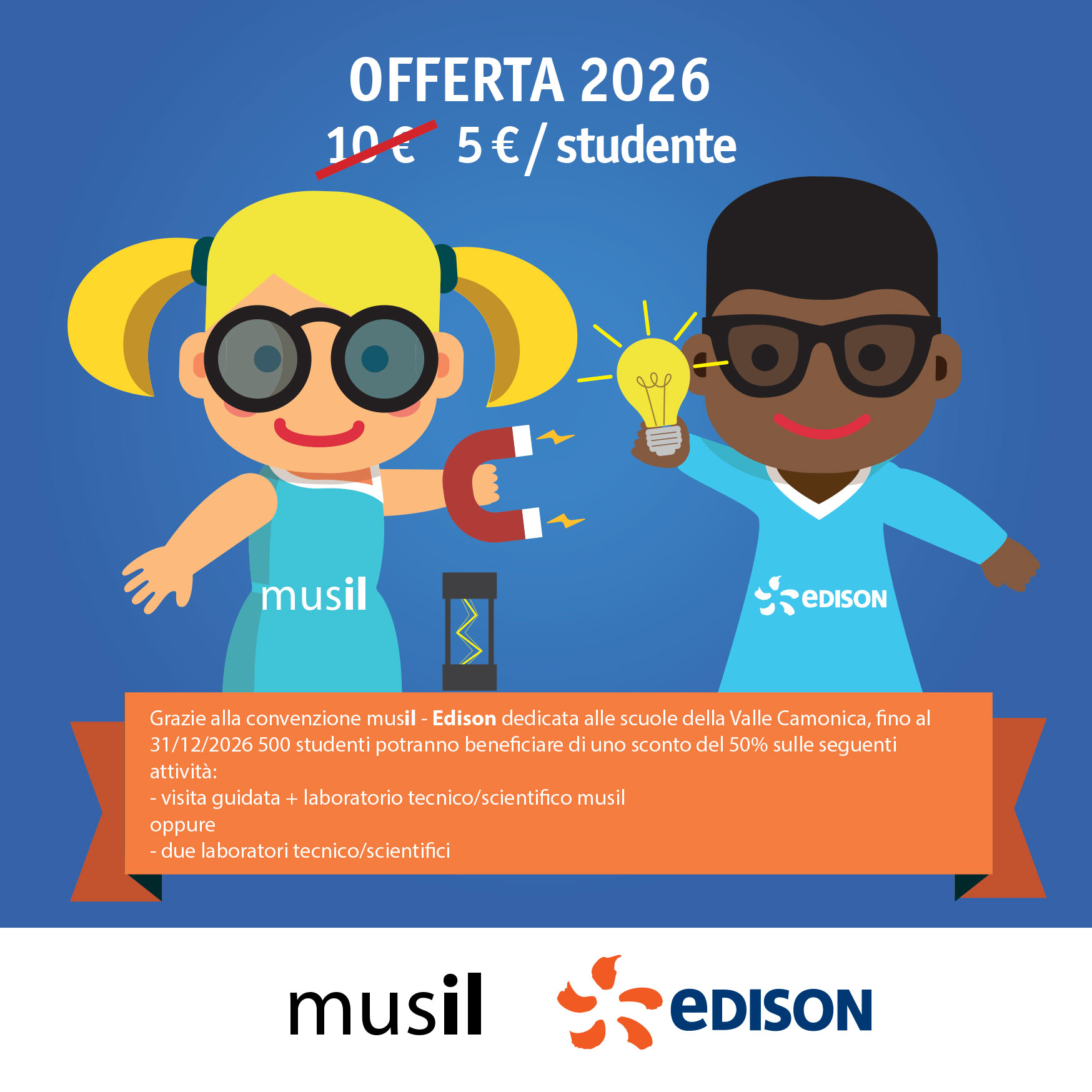 Anche quest'anno è in vigore la convenzione musil - Edison, valida fino al 31/12/2026, rivolta a 500 studenti delle scuole della Valle Camonica, che potranno beneficiare di uno sconto del 50% sulle seguenti attività: