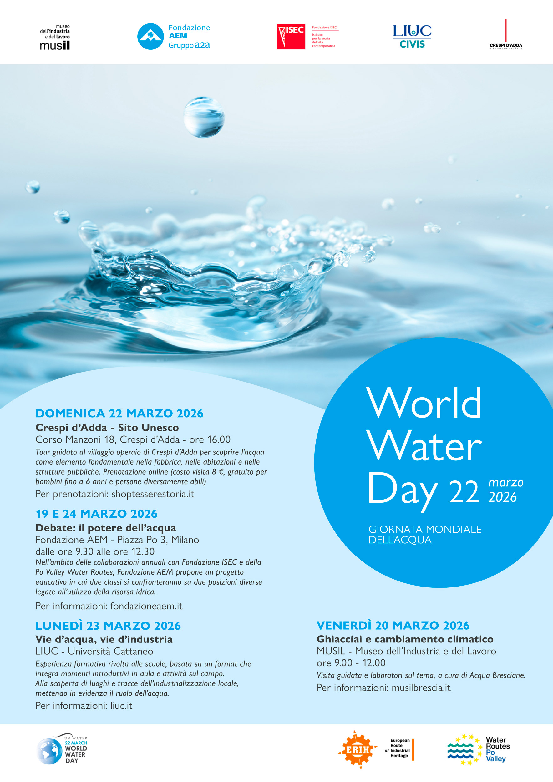 In occasione della Giornata Mondiale dell’Acqua – World Water Day, celebrata il 22 marzo 2026, diverse istituzioni promuovono una serie di appuntamenti dedicati al rapporto tra acqua, territorio, industria e cambiamento climatico. Il programma coinvolge musei, università e fondazioni con attività educative, visite guidate e momenti di confronto rivolti a studenti e cittadini.