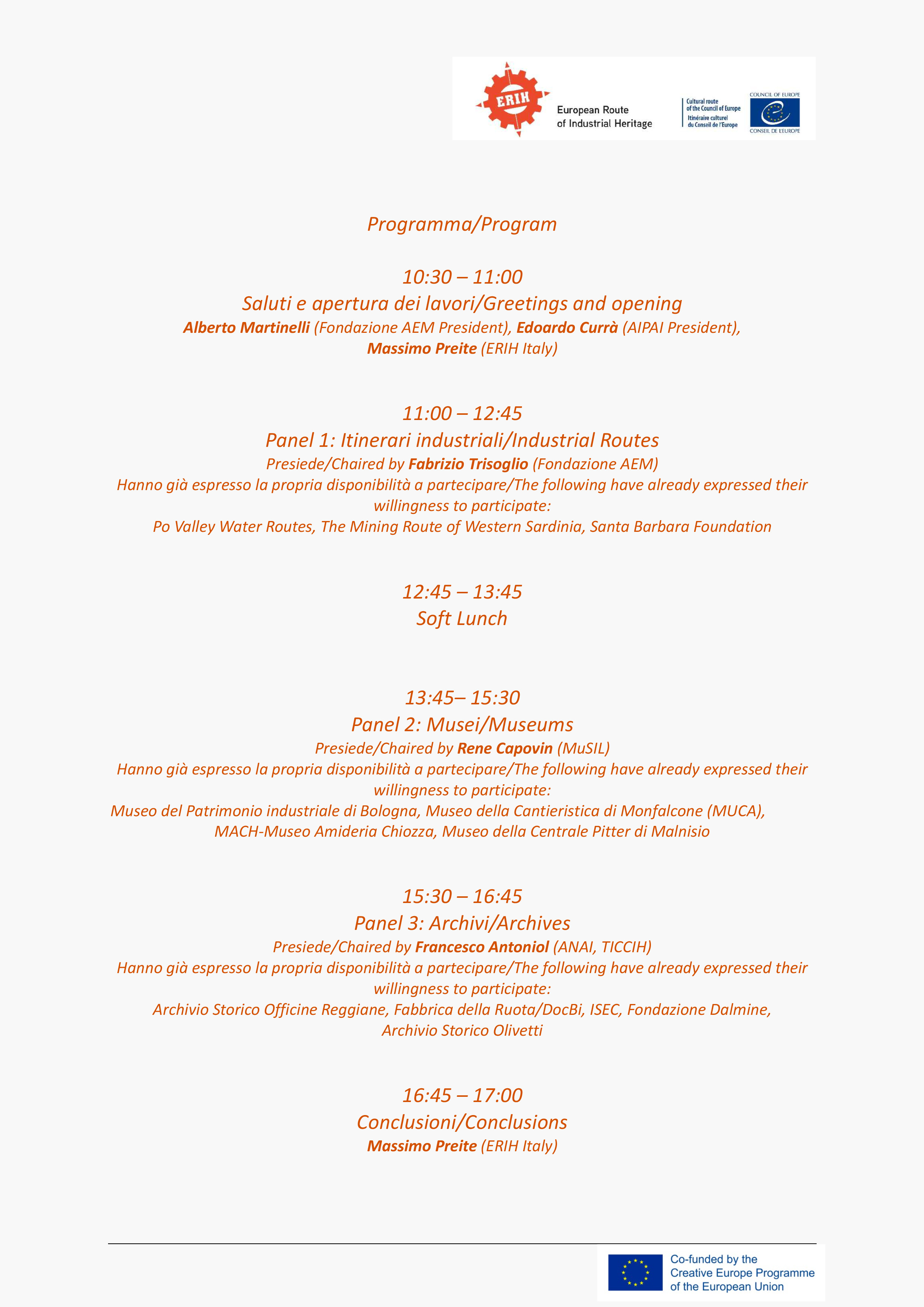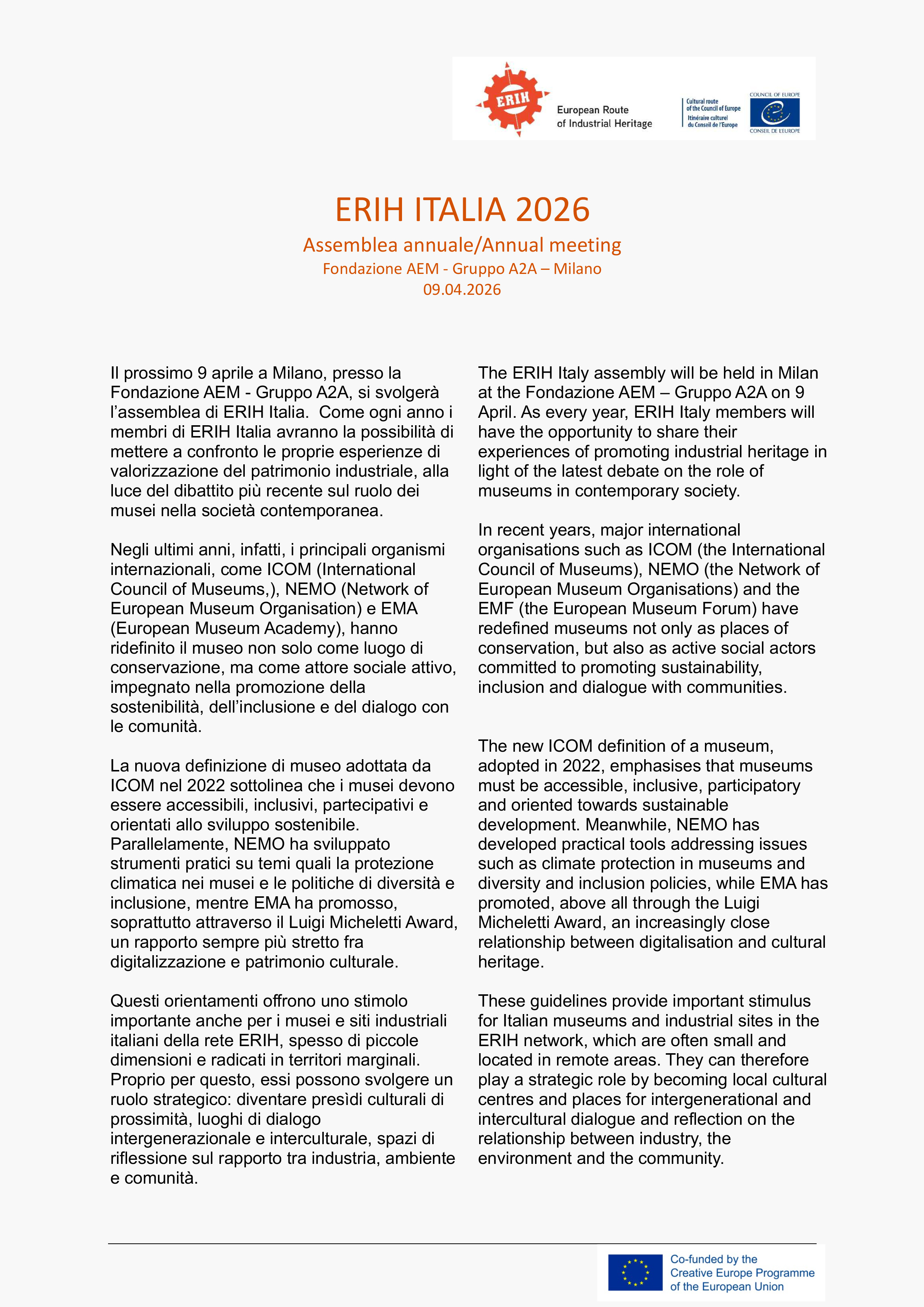 Come ogni anno i membri di ERIH Italia avranno la possibilità di mettere a confronto le proprie esperienze di valorizzazione del patrimonio industriale, alla luce del dibattito più recente sul ruolo dei musei nella società contemporanea. A questo proposito, l'invito all'assemblea ricorda il ruolo del Luigi Micheletti Award, unico premio museale europeo legato all'Italia, giunto quest'anno alla sua trentesima edizione